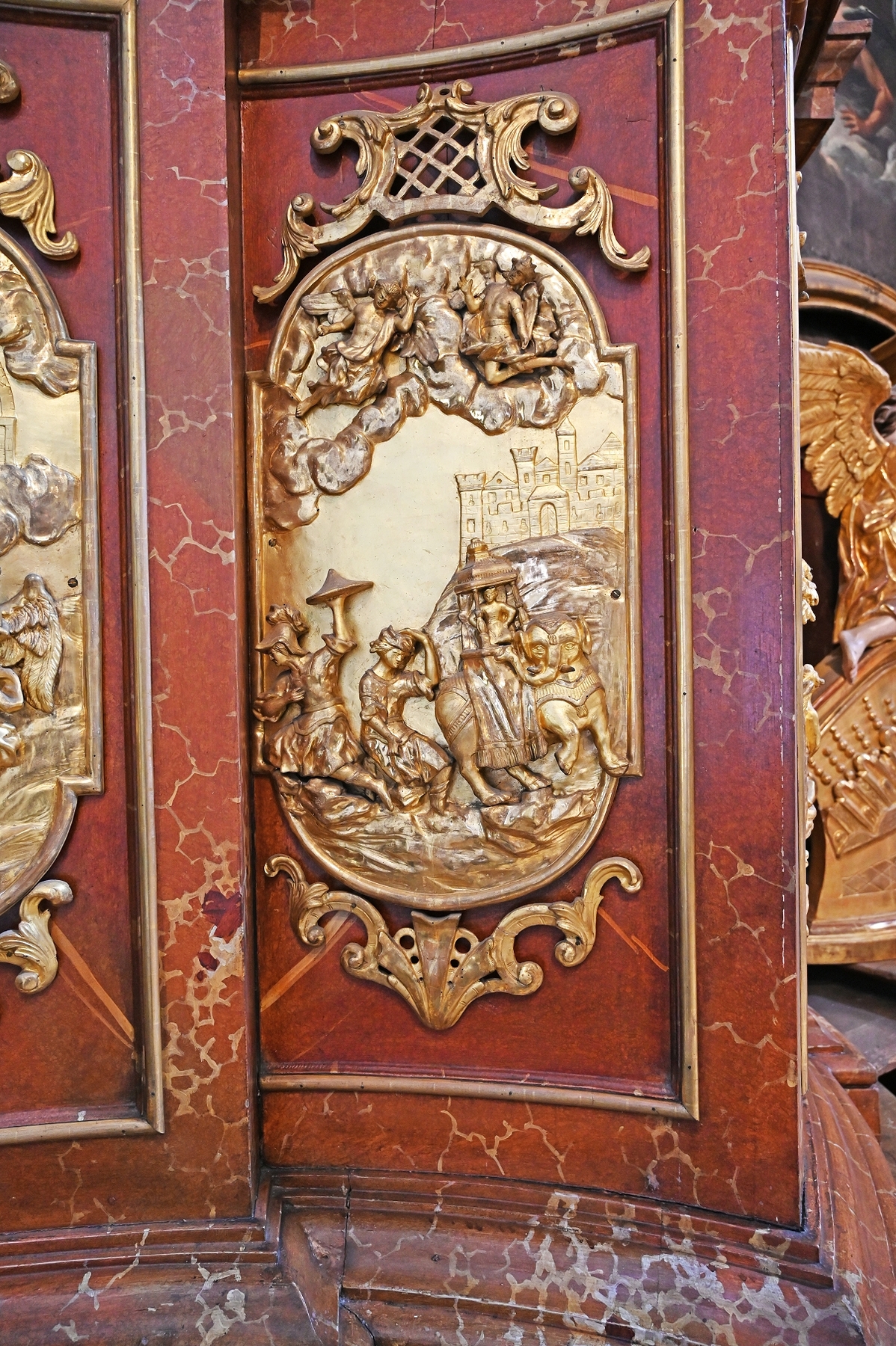 Holzrelief am Hochaltar: Zwei Engel schützen Judas Makkabäus