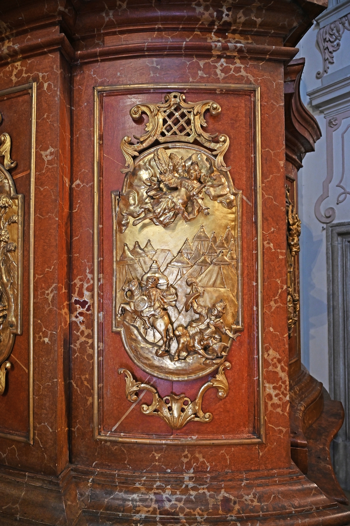 Holzrelief am Hochaltar: Engel tötet Assyrer