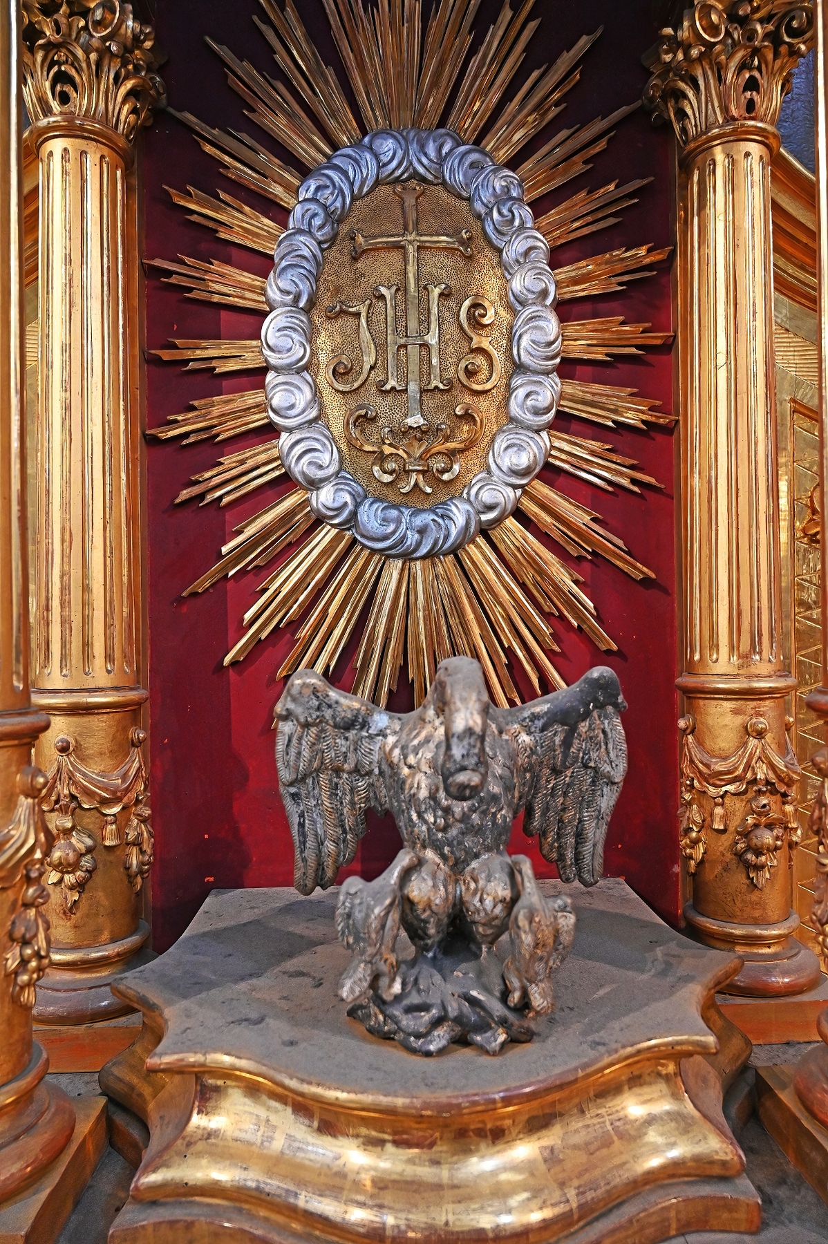 Hochaltar: Tabernakel mit Jesu-Monogramm und Pelikan