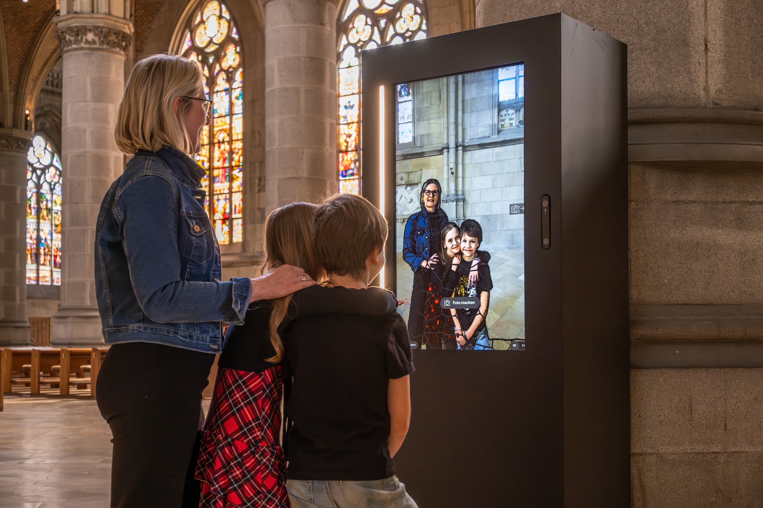 Ein anschauliches Beispiel für diese Verbindung von Vergangenheit und Gegenwart ist das Gemäldefenster „Grundsteinlegung“. Es zeigt eine symbolische Darstellung der Grundsteinlegung mit allen, die damals am Bau mitwirkten: Adel, Klerus, Handwerker – aber auch einfache Männer, Frauen und Kinder aus der Bevölkerung. Bei einer neuen digitalen Vermittlungsstation im Mariendom können sich Besucherinnen und Besucher nun selbst fotografieren lassen und virtuell Teil des historischen Fensters werden. Die Idee: Was damals im wörtlichen Sinn das Werk Vieler war, wird auch heute durch moderne Technik erlebbar und zeigt, wie Jede und Jeder Teil dieser großen Geschichte sein kann.