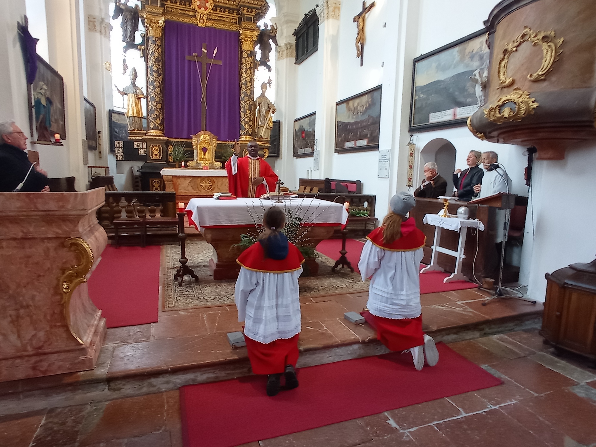 Nach einer kleinen Andacht bei der Valentinskapelle führte die Palmprozession zur Kirche, wo der nigerianische Aushilfspriester Cosmas Gimba den Gottesdienst zelebrierte. Danke Cosmas.