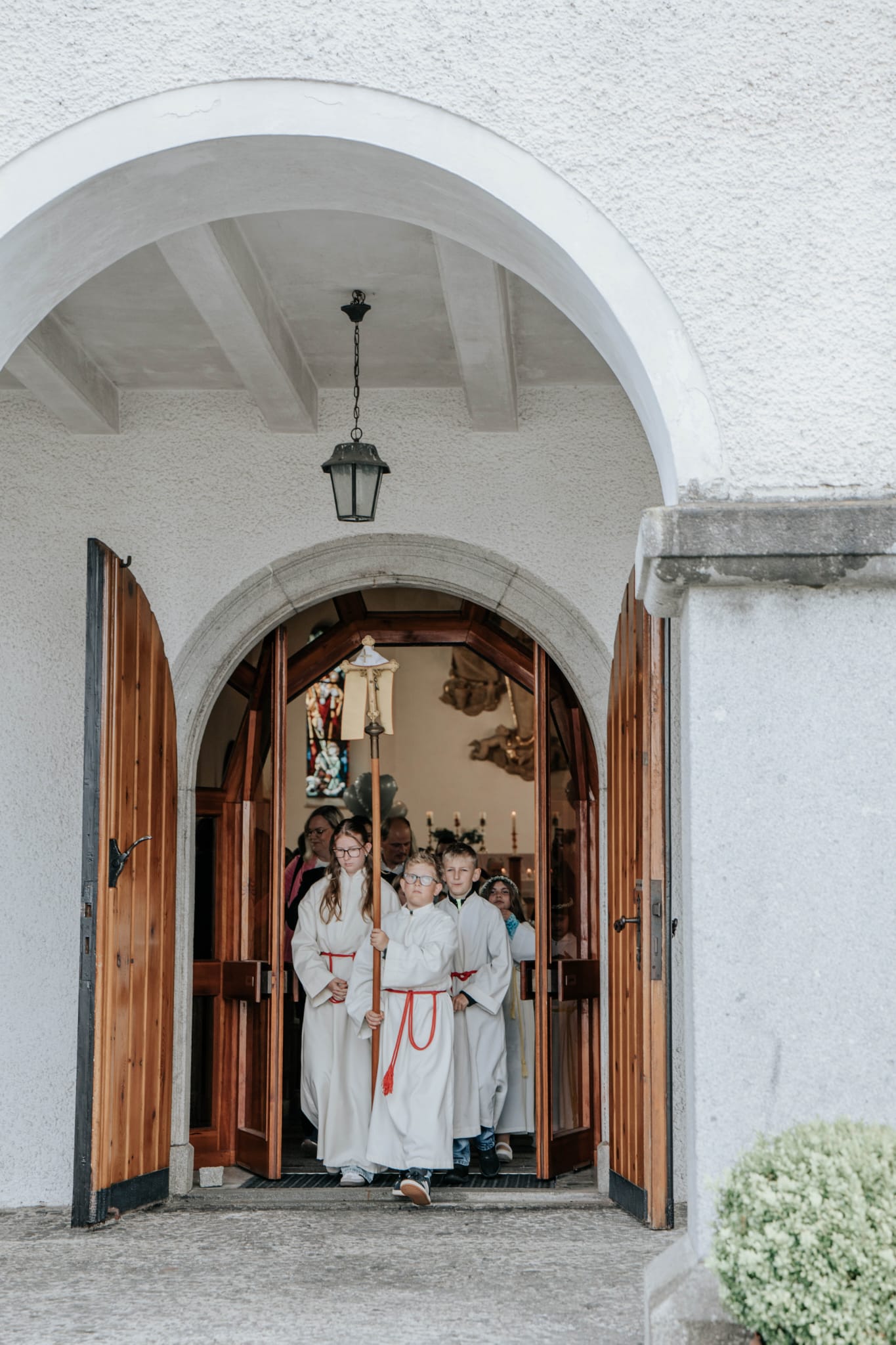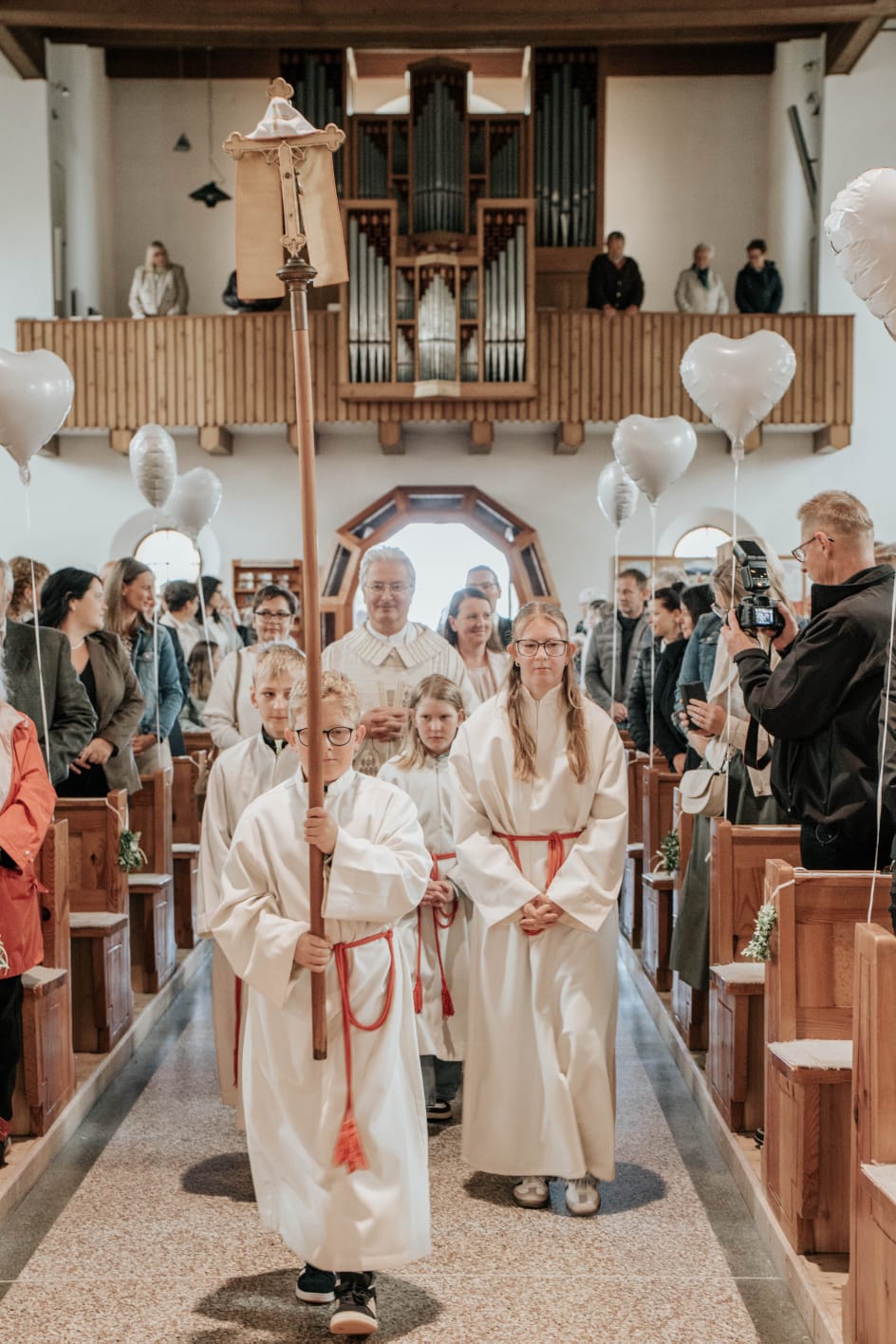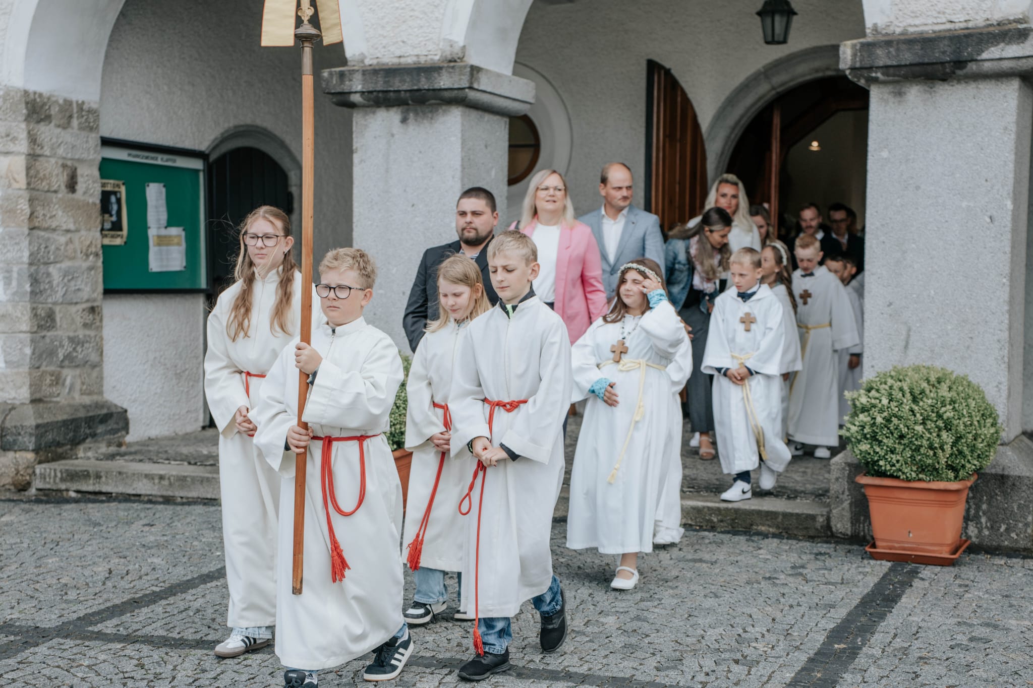 Es war trotzdem ein frohes Fest. Der Festgottesdienst wurde von der Volksschule musikalisch gestaltet, anschließend marschiertenn die Erstkummunionkinder mit ihren Familien in den Pfarrsaal.