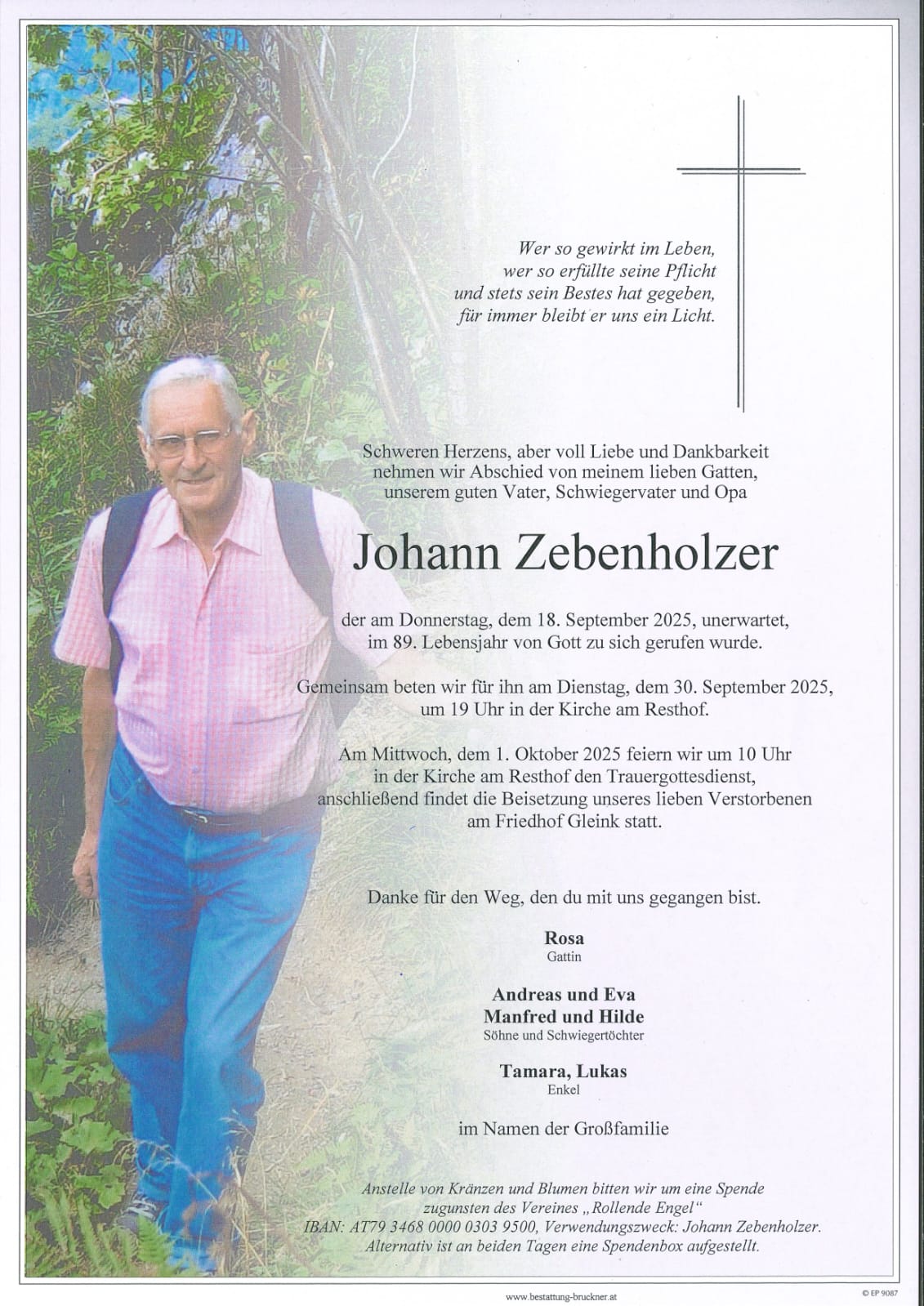 Totengebet für unseren lieben Verstorbenen Johann Zebenholzer
