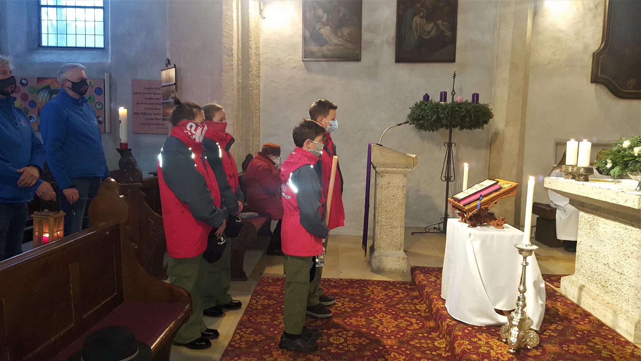Die drei Kerzen am 3. Adventsonntag wurden entzündet und das Licht in der Laterne in die Kirche gebracht. Am Heiligen Abend kommen die Jung-Feuerwehrmänner und Frauen und bringen das Friedenslicht in die Häuser.